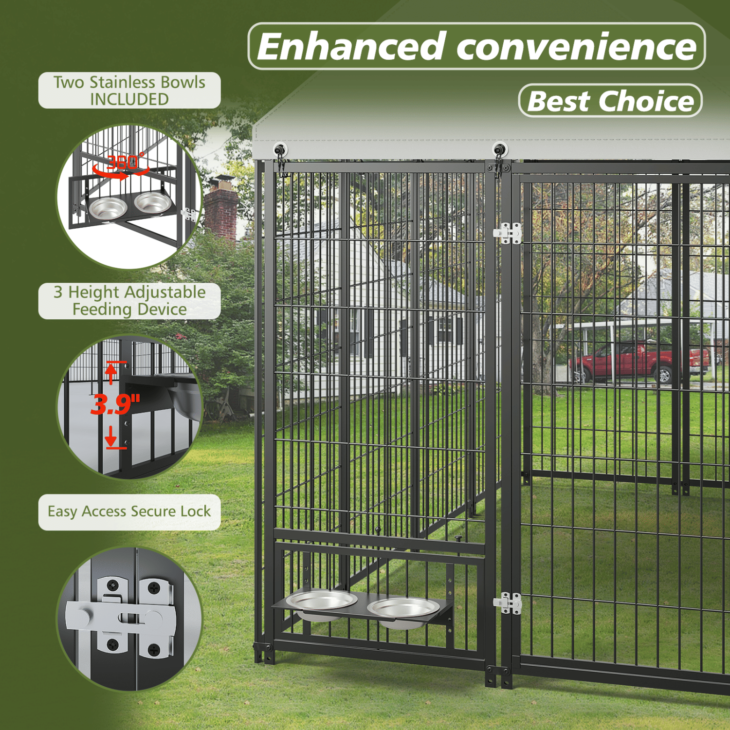 Reinforced structure: This outdoor dog cage is made of high-quality metal iron, with multiple load-bearing columns added for greater stability. The double door lock design prevents your pet from rushing out of the cage.